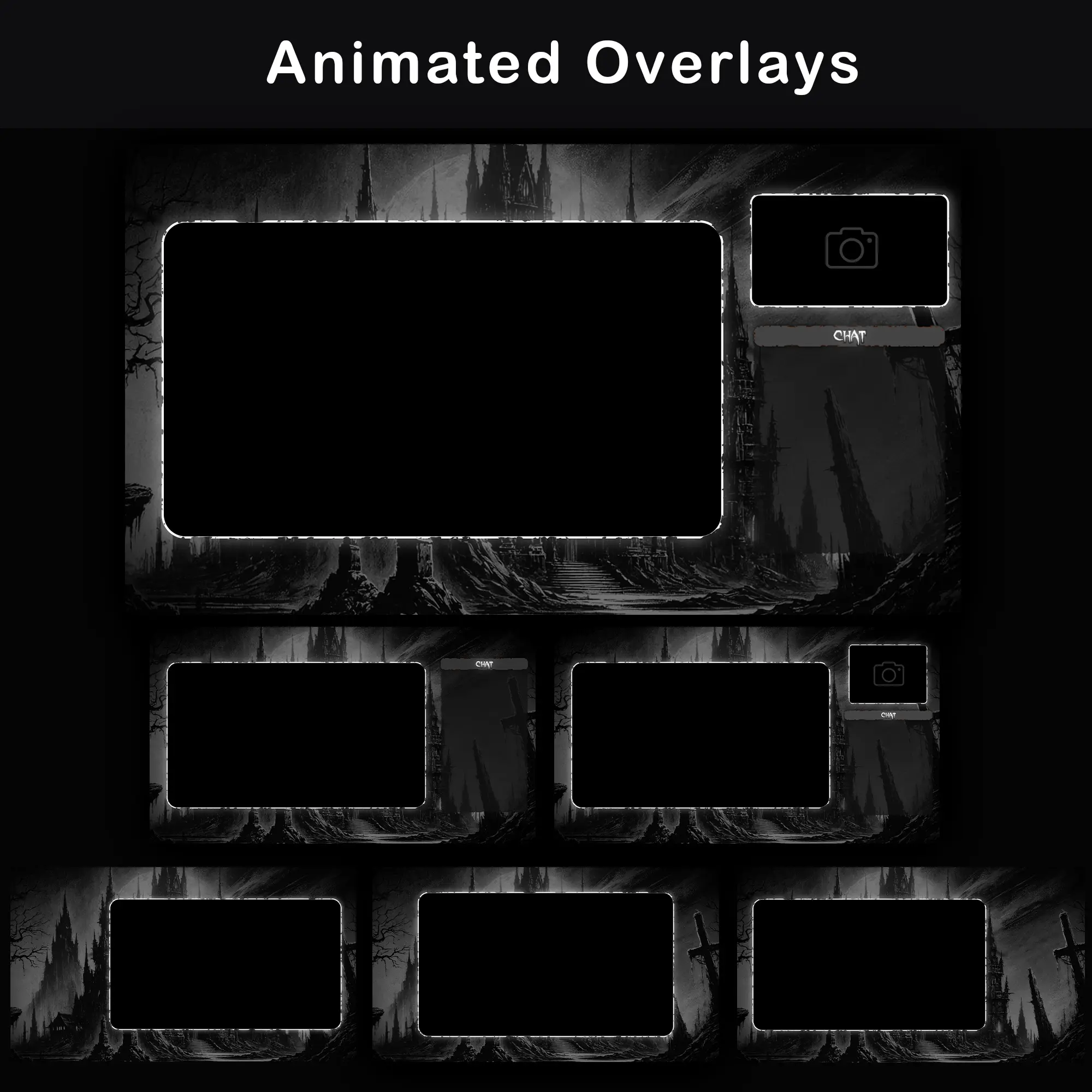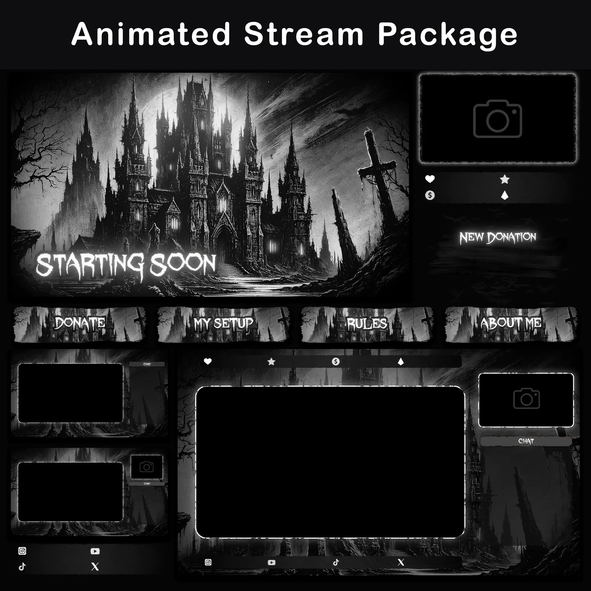 The gothic grunge graphics are rendered in a fixed monochromatic palette of black, white, and grayscale. There is no built-in color adjustment option in the source files. Advanced users can experiment with Color Correction filters in OBS to tint the output, but the monochrome B&W aesthetic is core to this product’s visual identity. Choosing a pack in colors that match the channel’s brand from the start is recommended.