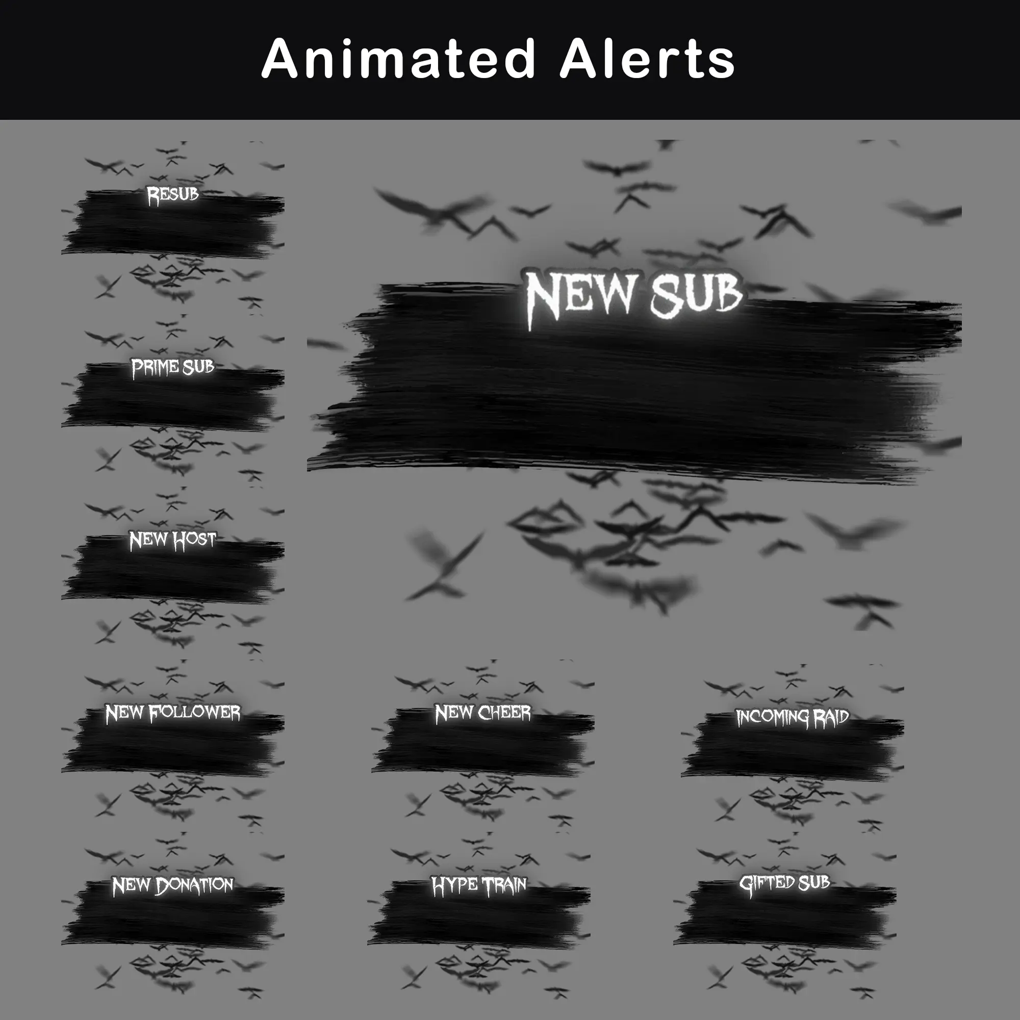 WebM — Gifted Sub, Hype Train, Incoming Raid, New Cheer, New Donation, New Follower, New Host, New Sub, Prime Sub, Resub. Every standard Twitch event has a matching on-brand animation with brush stroke compositions and looping vector bats, so no notification fires without a gothic visual response.