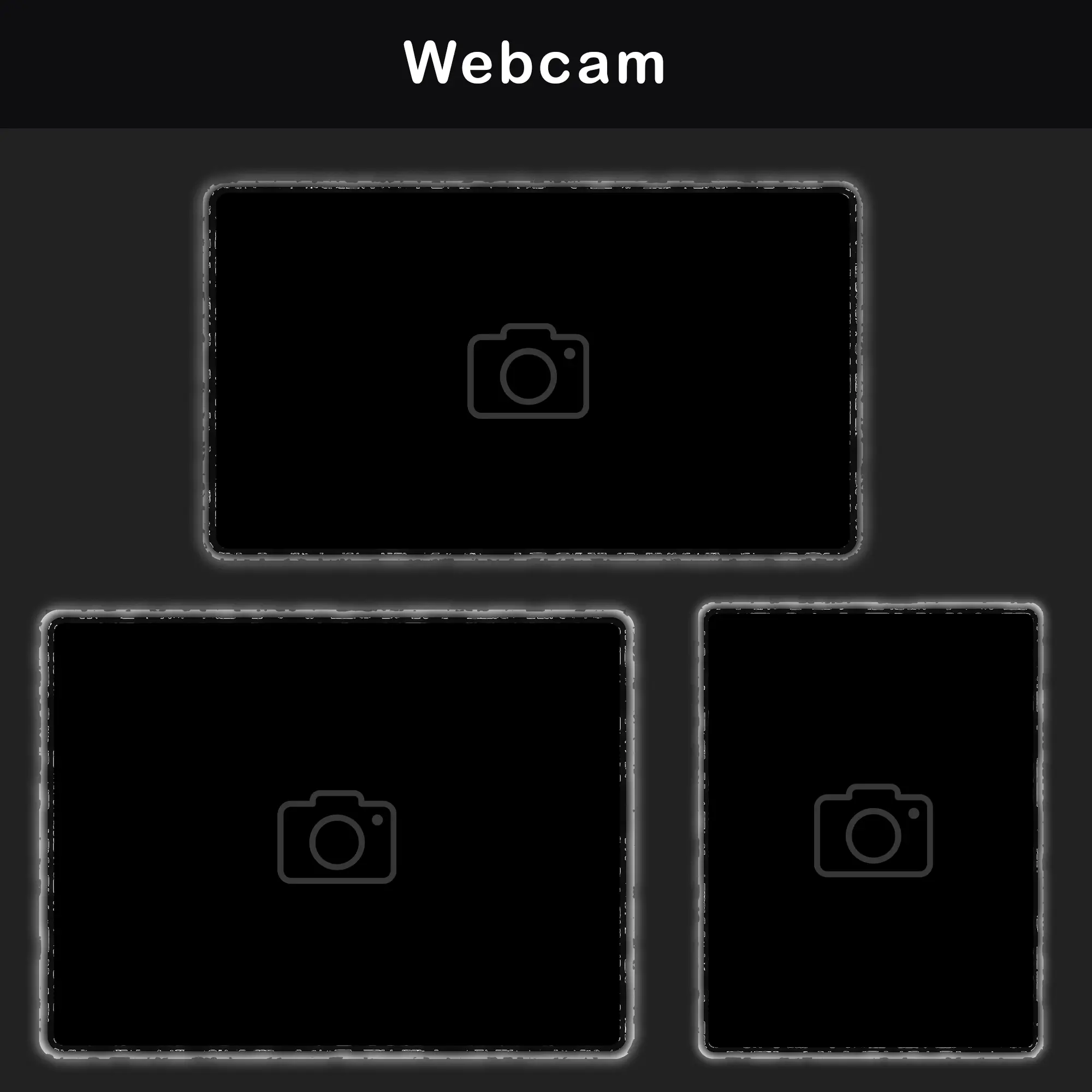 WebM, PNG — Format ratios 16:9, 4:3, 3:4 + masks. Three aspect ratios mean the frame fits any camera crop without stretching or black bars. Each webcam overlay features the dual-layer pulsing luminous outline.