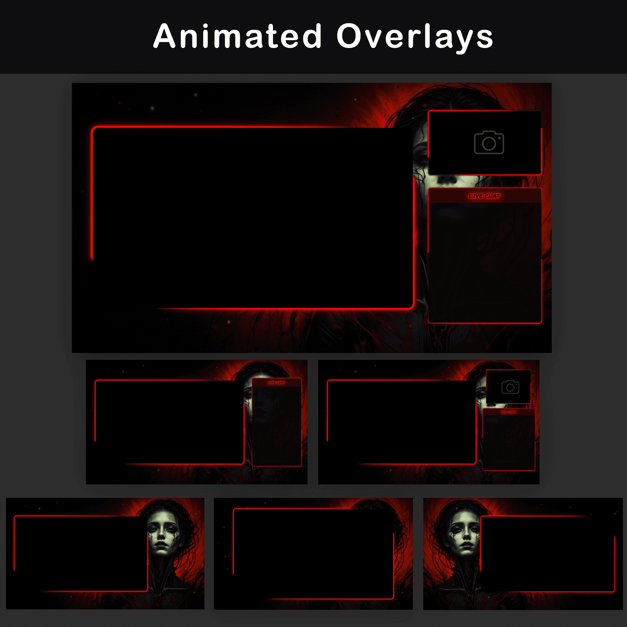 WebM, PNG — Six stream overlay layouts with and without camera and chat boxes. These configurations cover every standard streaming scenario while maintaining the minimalist aesthetic.