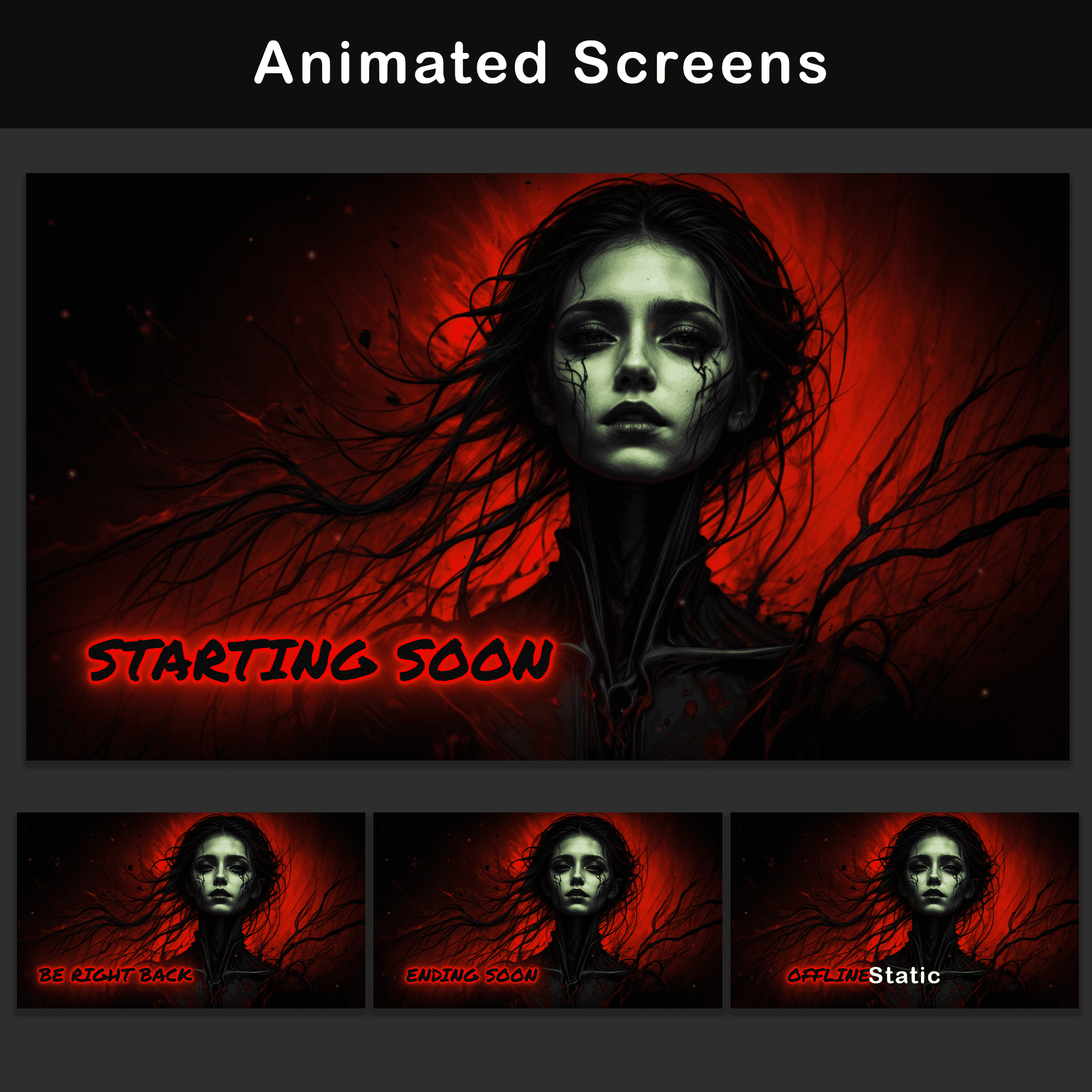 MP4, PNG — Starting Soon, BRB, and Stream Ending screens, plus a static Offline screen (PNG). Each screen uses the same crimson glitch typography against a dark ember-filled background, keeping the visual identity consistent between live segments.