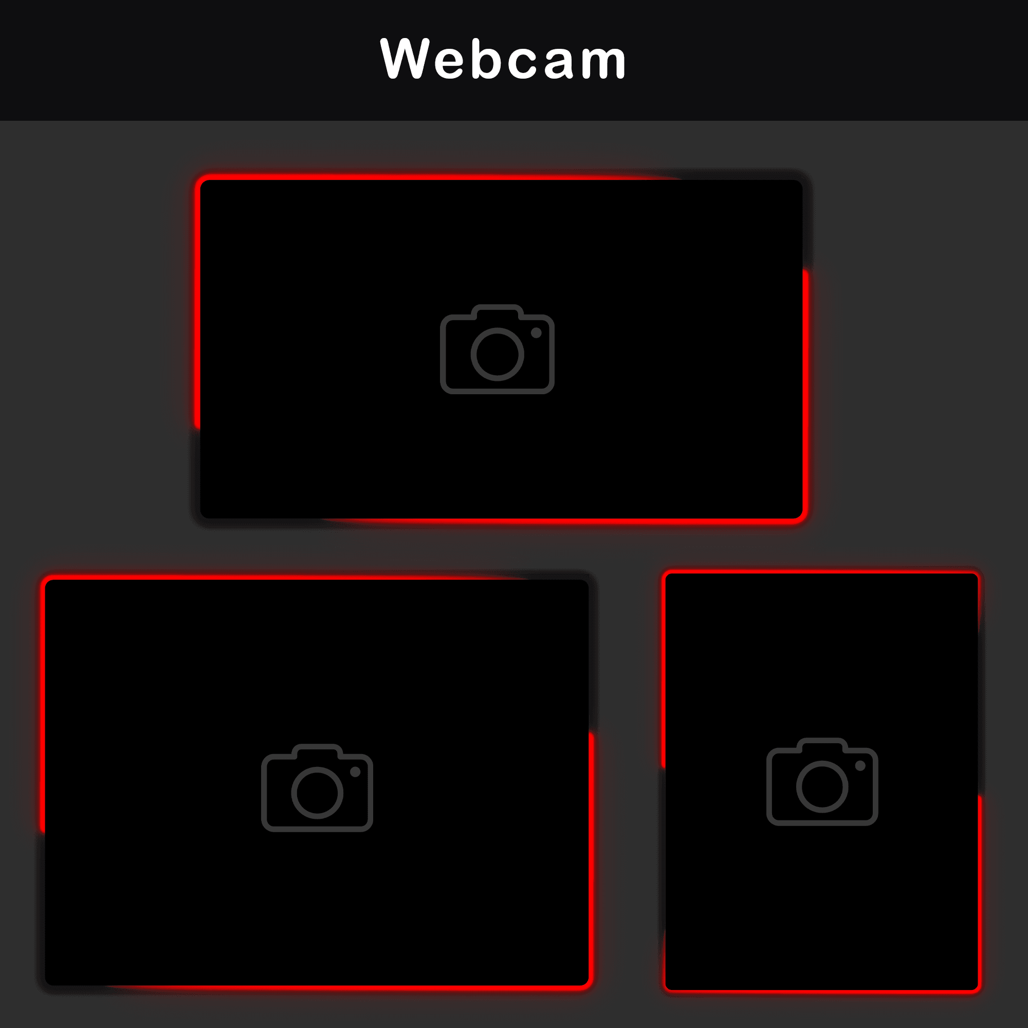 WebM, PNG — Three webcam frames in 3:4, 4:3, and 16:9 formats, plus dedicated masks. Each frame wraps the camera feed in a minimal crimson border.