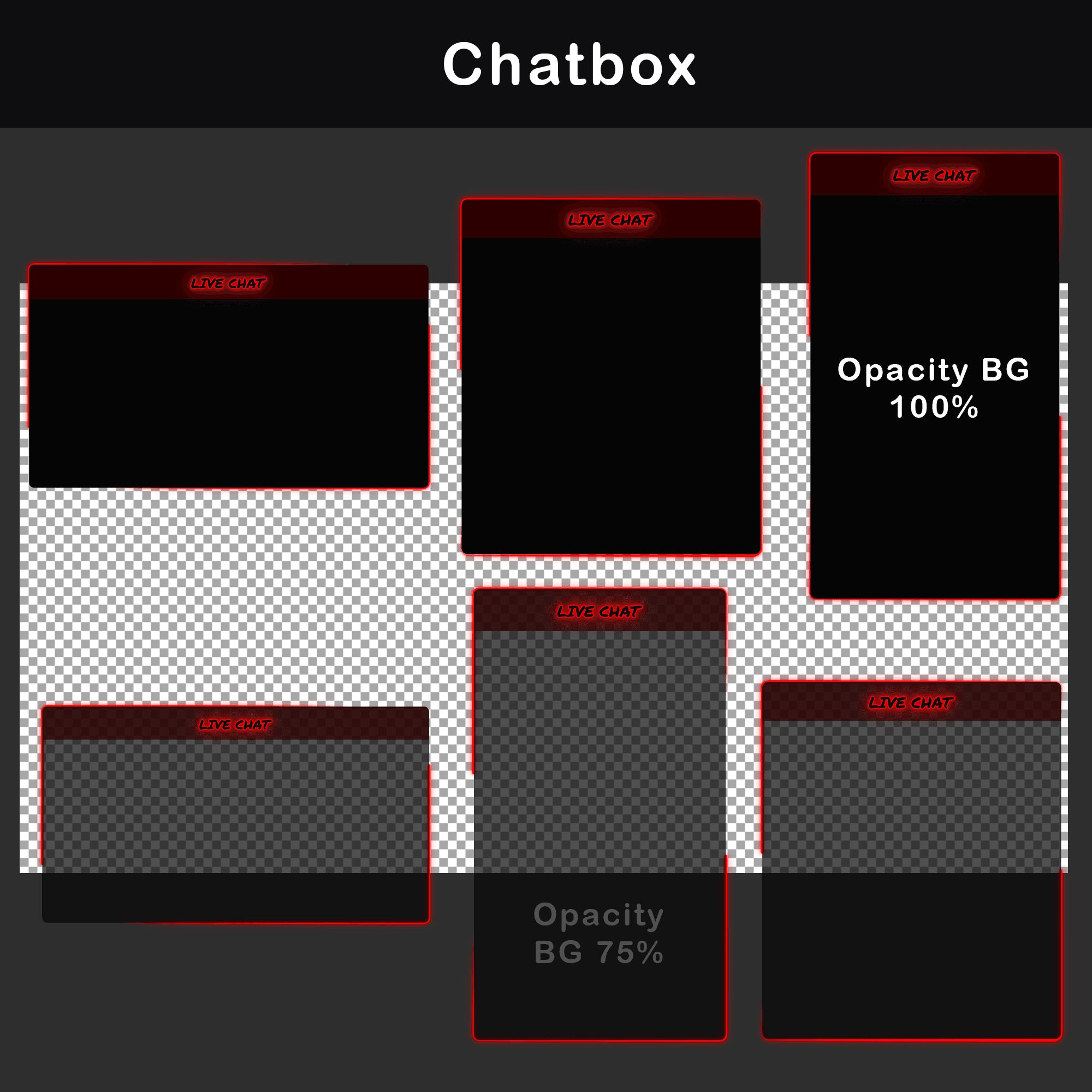 WebM, PNG — Three transparent (75% opacity) and three solid background chatboxes. Choose the version that balances readability against each scene’s visual density.